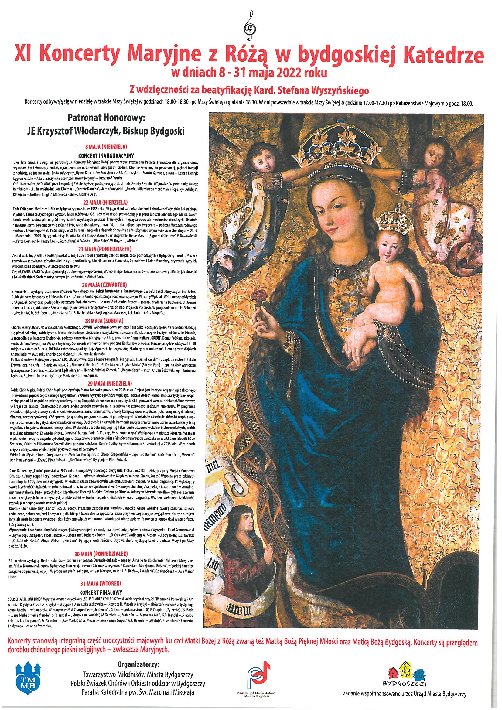 Dwa lata temu, z uwagi na pandemię „X Koncerty Maryjne z Różą” poprzedzone życzeniami Papieża Franciszka dla organizatorów, wykonawców i słuchaczy zostały ograniczone do odśpiewania kilku pieśni on-line. Obecnie wracamy do poszerzonej, pięknej tradycji z nadzieją, że już na stałe. Znów usłyszymy „Hymn Koncertów Maryjnych z Różą”, muzyka – Marcin Gumiela, słowa – Leszek Henryk Łęgowski, solo – Ada Gliszczyńska, akompaniament (organy) – Krzysztof Fryszka.